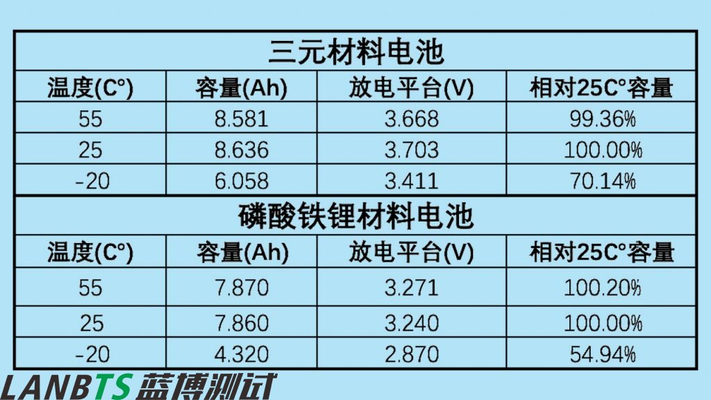 “相對25℃容量”是指不同溫度條件下放電容量與25℃時放電容量的比值。該數值能夠準確反映出電池在不同溫度條件下續航的衰減,越接近100%,電池表現越好。